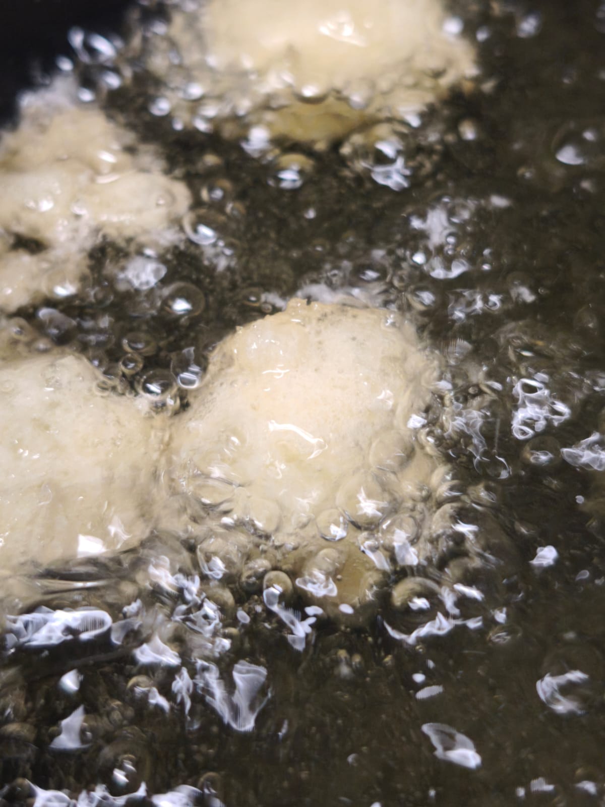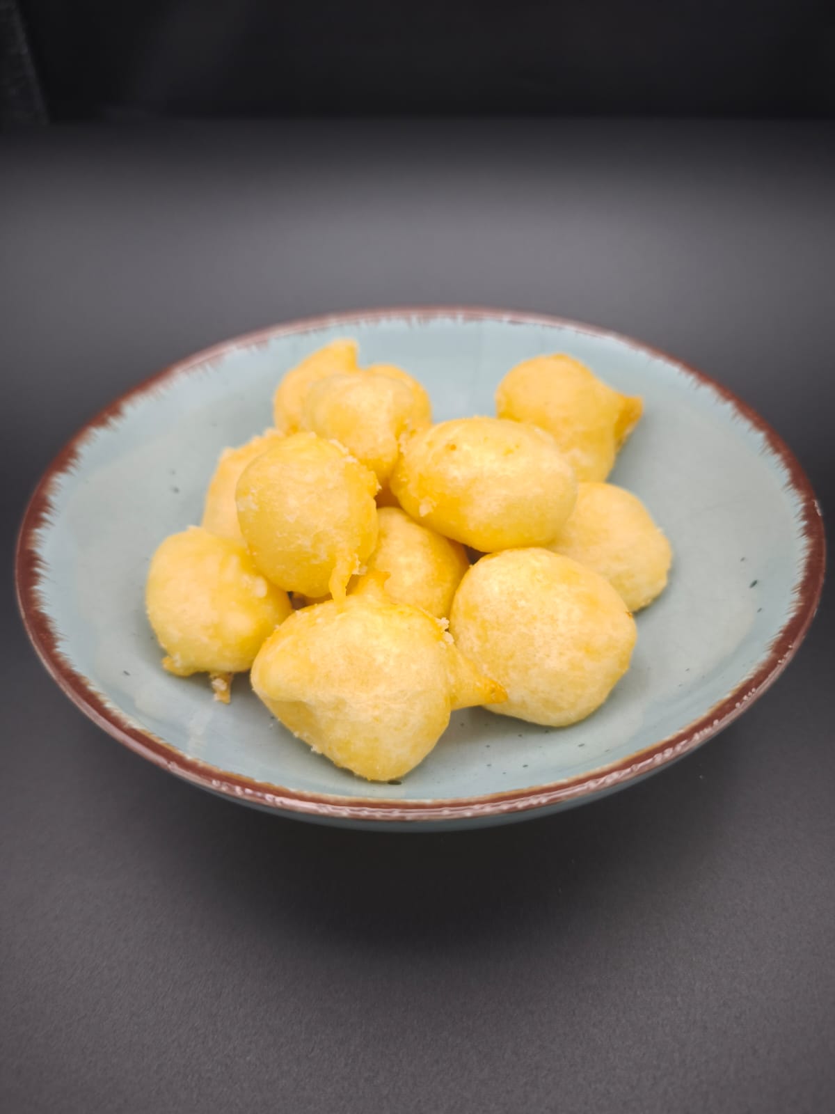 Nun die Curds einzeln in den Teig geben und wenn sie komplett bedeckt sind in die Fritteuse, um sie goldbraun zu backen.
